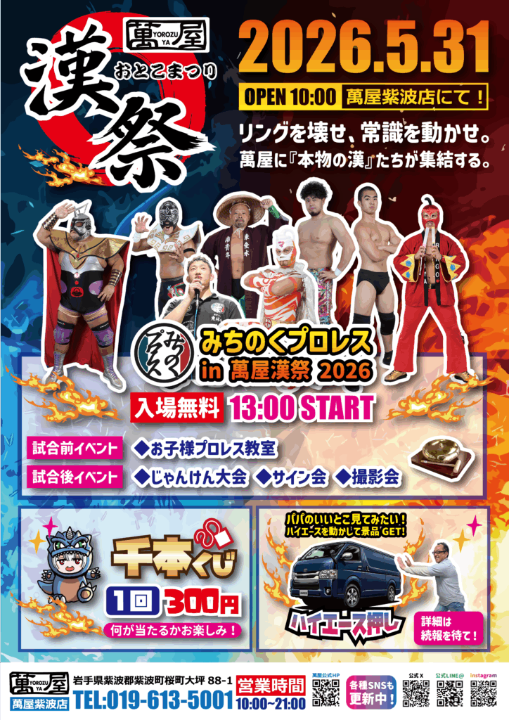 🔥リングを壊せ、常識を動かせ。 萬屋に『本物の男』たちが集結する。✨『みちのくプロレス』参戦決定! ✨その他、己の筋力でハイエースを動かす「ハイエース押し」など男気イベントも企画中!
