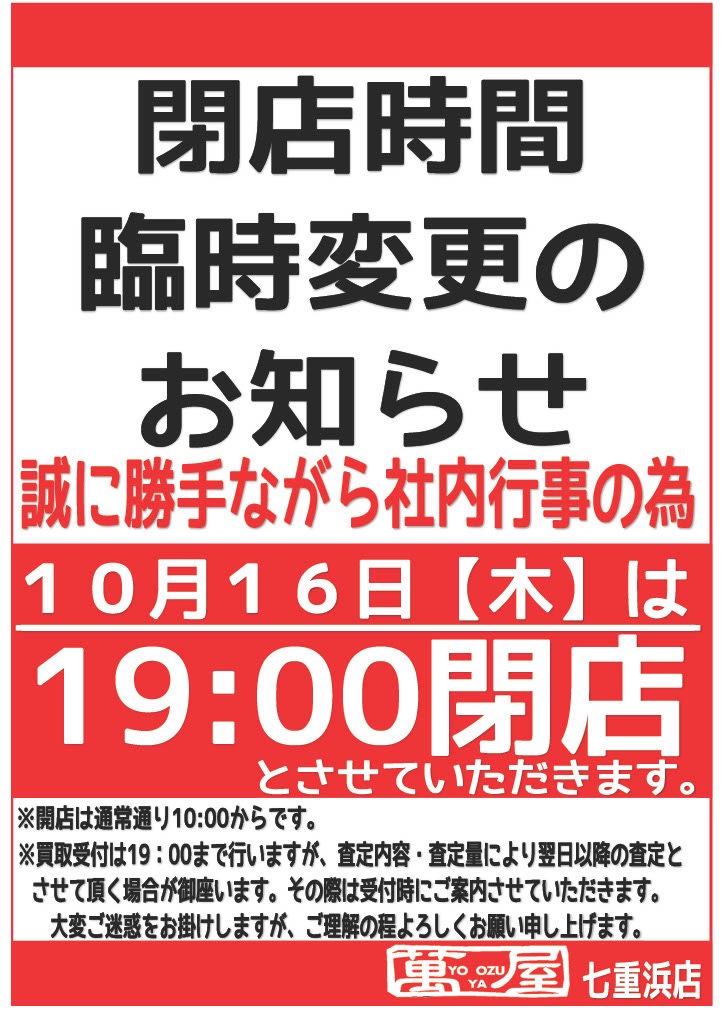 誠に勝手ながら、社内行事のため10月16日は下記の画像の通り、閉店時間を19時に変更させていただきます。
