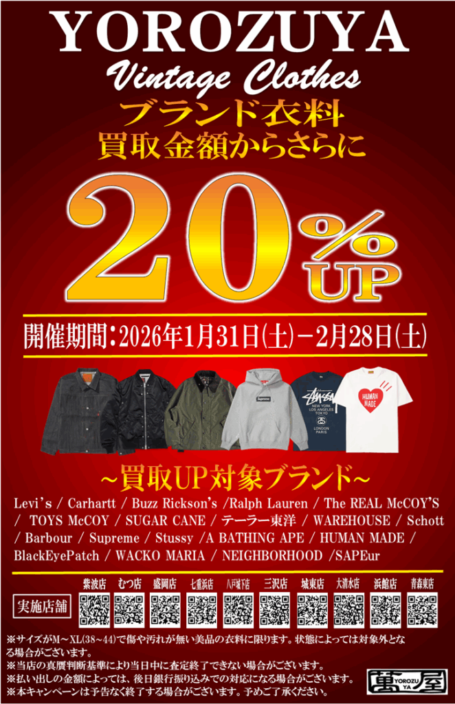 1/31から萬屋全店合同で古着一部ブランドを対象に買取20%UPを2/28まで開催致します! 詳しく...