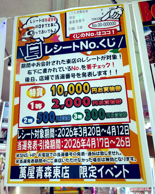3/20~4/12までのお買上げレシートが対象の【レシートNo.くじ】を開催中❗❗